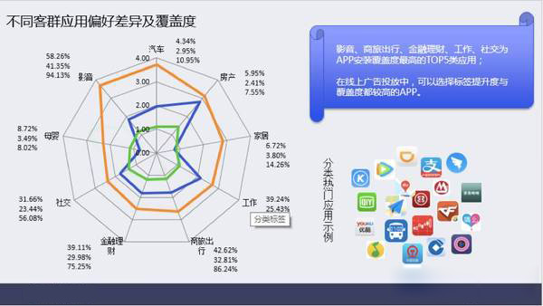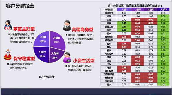 在對(duì)商圈人群完成360度用戶畫像后,可從不同維度實(shí)現(xiàn)對(duì)人群的分類管理。在已有的實(shí)踐嘗試中,年齡、婚姻狀況、車輛保有情況、性別、設(shè)備品牌、應(yīng)用偏好都可稱為進(jìn)一步交叉分析、聚類分析的基礎(chǔ)維度。結(jié)合該商業(yè)地產(chǎn)企業(yè)的自身需求,華錦億爵大數(shù)據(jù)技術(shù)團(tuán)隊(duì)以線上應(yīng)用偏好作為最重要的聚類基礎(chǔ),將商圈內(nèi)人群分為偏好差異明顯的幾種不同類型,從而便于把握不同類型客群的消費(fèi)特征,為商業(yè)主力客群的選定準(zhǔn)備了有力的數(shù)據(jù)支持。