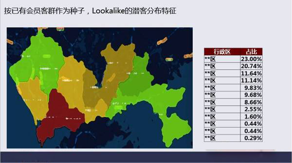 對(duì)開發(fā)企業(yè)而言,已有項(xiàng)目的運(yùn)營(yíng)操作經(jīng)驗(yàn)可復(fù)制性高,但在前期定位階段對(duì)不同商圈的認(rèn)知往往無法復(fù)制。結(jié)合大數(shù)據(jù)工具和lookalike算法技術(shù),企業(yè)已積累的消費(fèi)客群將成為重要的種子數(shù)據(jù),以此作為學(xué)習(xí)對(duì)象,將快速模擬出在不同商圈內(nèi)的潛客分布情況。這一重要突破將快速建立項(xiàng)目定位和目標(biāo)客群間的映射關(guān)系,極大提升企業(yè)入駐陌生商圈的成功率。